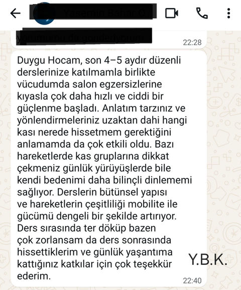Öğrencilerim bilirler, dans kökenli olduğum ve sportif-latin branşında milli sporcu, sonrasında antrenörlük ve milli hakemlik şeklinde devam eden geçmiş kariyerim sebebiyle; egzersizde, hem sakatlıklardan korunmanın, hem de limitleri zorlayarak maksimum verim almanın önemine inanıyorum. Kısa sürede hissedilen değişimlerin yanında, yapılan egzersizin uzun vadede sıkılmadan devam ettirilebilir olması, bedenin ihtiyaçlarını bütünsel olarak kapsayabilmesi ve bu sebeple çok yönlü olması da çok önemli.